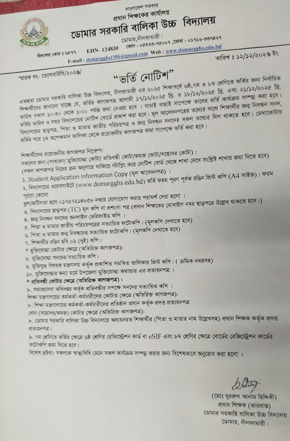 ভর্তি বিজ্ঞপ্তি ২০২৬